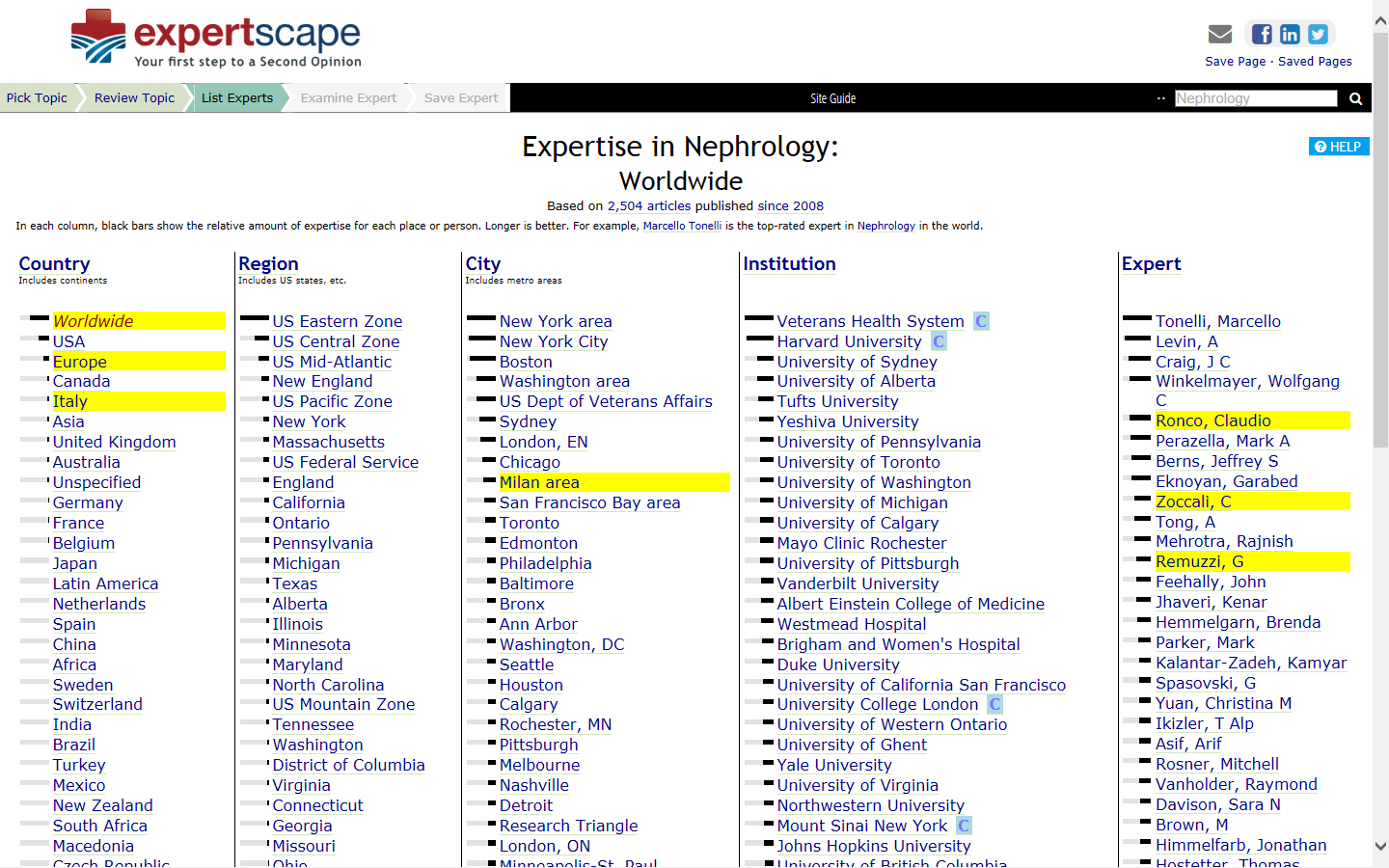 Fa piacere trovare l’Italia “nefrologica” ancora ai vertici e, precisamente, in terza posizione dopo USA e Canada, seguita poi da UK, Australia, Germania, Francia, Belgio, Giappone e Olanda completare la Top Ten (in "Nephology"), laddove spiccano ben due ricercatori italiani tra i primi dieci nella generica classifica capeggiata stabilmente dal Canadese Marcello A. Tonelli della Università di Calgary.